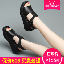 2017新款松糕底罗马凉鞋女 百搭妈妈鱼嘴鞋坡跟真皮厚底女鞋夏