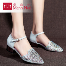 2017新款夏品牌粗跟鱼嘴鞋中跟真皮高帮镂空凉鞋鱼嘴大码网纱女鞋