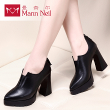 2017新款春秋尖头高跟鞋粗跟欧美单鞋女真皮女鞋深口黑色皮鞋