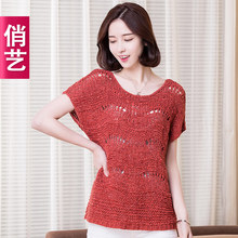 俏艺 夏季新款 淑女蝙蝠袖镂空圆领短袖针织t恤衫女上衣 3495