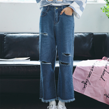 2017年新款破洞牛仔裤女学生春夏显瘦百搭水洗阔腿直筒不规则毛边