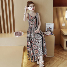 民族风连衣裙夏中长裙松紧腰海边度假裙女 大摆纯棉无袖连衣裙