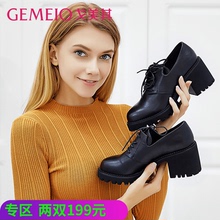 戈美其2016秋季欧美单鞋女粗跟防水台系带圆头高跟女鞋子