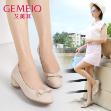戈美其2016新款女鞋甜美圆头浅口蝴蝶结单鞋女高跟粗跟米色四季鞋