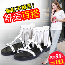 戈美其2016夏新款女鞋流苏露趾白色罗马鞋铆钉后拉链平底平跟凉鞋