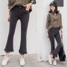 喇叭牛仔裤女2017韩版不规则九分裤毛边流苏显瘦微喇休闲9分裤女