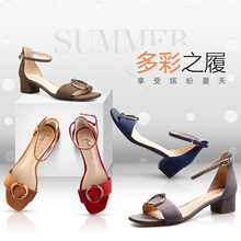 fed2017夏季新款气质环扣粗跟凉鞋 纯色一字扣带露趾女鞋1884772