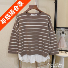 秋装新款韩版衬衫拼接假两件条纹针织衫九分袖宽松套头毛衣女上衣
