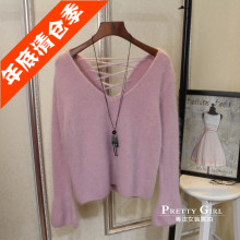 秋冬名媛小香风后背绑带喇叭袖兔毛貂绒套头毛衣女纯色打底针织衫