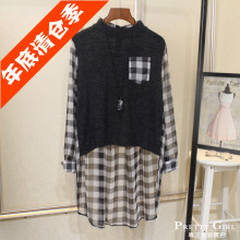韩版格子拼接宽松套头针织衫前短后长圆领中长款雪纺衫拼色衬衫女