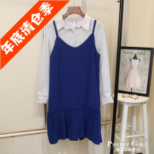 韩版长袖条纹衬衫吊带裙两件套女学院风宽松荷叶边中长款连衣裙潮