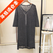 欧洲站秋装新款链条拼接v领中长款冰丝针织衫前短后长中袖连衣裙