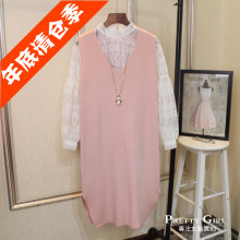 2015秋冬新款韩版宽松花边半高领钩花镂空中长款打底蕾丝连衣裙仙
