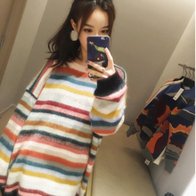 2016秋冬孕妇宽松套头针织中长款彩虹彩色条纹孕妇圆领毛衣连衣裙