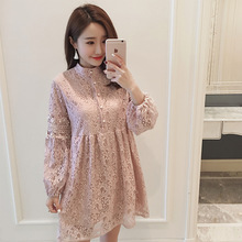 2017春装新款孕妇装韩版宽松大码立领显瘦哺乳粉色孕妇蕾丝连衣裙