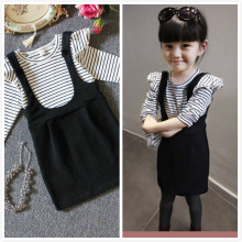 2015春秋女童韩版条纹假两件纯棉长袖儿童淑女背带裙连衣裙子套装