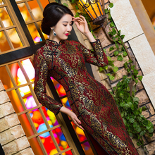 湘绣晚礼服秋冬新款中长款中长袖金丝绒旗袍女改良妈妈旗袍连衣裙
