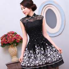 水草花 新款黑色蕾丝甜美气质改良日常修身短款淑女旗袍连衣裙
