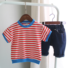 复古文艺T恤,男女童条纹圆领纯棉T,纯棉撞色海军衫 韩国童装夏