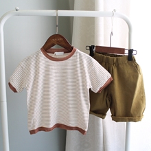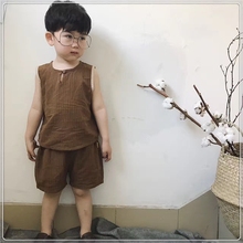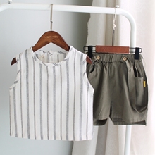 男女童棉麻套装,儿童条纹无袖背心短裤2件套,夏季复古韩国童装
