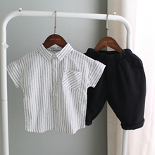 文艺气质的条纹棉麻衬衫,男童女童夏季短袖衬衣,韩国童装定制