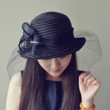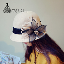 秋冬季保暖毛呢帽子女卷边圆顶麻纱花朵羽毛欧美风英伦复古小礼帽