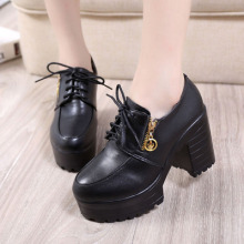 2016秋季新款高跟粗跟单鞋PU英伦系带圆头松糕厚底防水台休闲女鞋