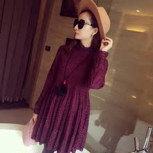 蕾丝连衣裙秋冬2016新款收腰春款百搭韩版紫色长袖修身中长款韩国