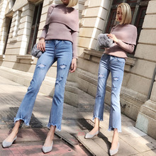 2017春季新款韩国破洞微喇叭牛仔裤女修身显瘦毛边高腰阔腿裤8829