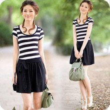2016夏季新品韩版女装蝴蝶结条纹拼接连衣裙 气质修身显瘦系带裙