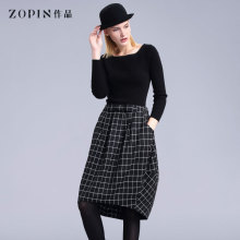 Zopin作品欧美高端女装秋冬长袖修身打底裙针织拼格仔连衣裙