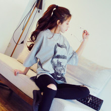 2017夏新款 欧美范潮灰色棉质短袖正反印花宽松下摆开叉短袖T恤