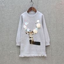 2016秋冬新款童装 女童韩版中长款套头毛衣 中大童毛边针织衫小鹿