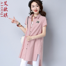 竖条纹短袖衬衫女夏2017新款宽松韩版百搭大码胖mm衬衣中长款上衣