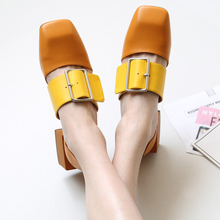 2017夏新款韩版复古方头包头大方扣中空粗跟凉鞋中跟单鞋女潮