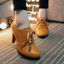 新款英伦女鞋尖头系带高跟鞋欧美黑色真皮粗跟深口单鞋女秋季
