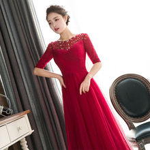 晚礼服2016新款酒红色一字肩宴会礼服裙大码新娘敬酒服长款女中袖