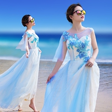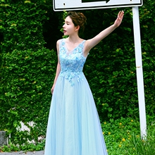2017新款夏季伴娘裙生日礼服蓝色花朵伴娘礼服 聚会派对晚礼服