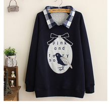 2017春装新款格子翻领长袖小鸟贴布加绒卫衣日系森女系连衣裙
