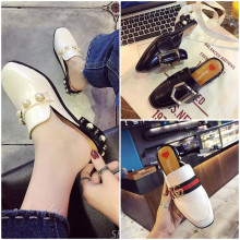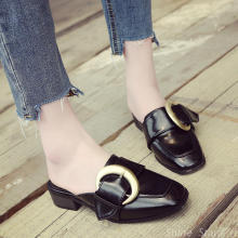 2017夏季新款欧洲站半托包头懒人鞋女粗跟中跟方头珍珠金属扣单鞋