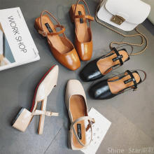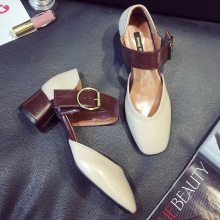 2017夏季新款一字扣粗跟单鞋女木跟复古女鞋凉鞋夏季中跟玛丽珍鞋