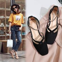 2017新款夏季粗跟高跟鞋绑带中跟女鞋一字扣尖头百搭包头罗马凉鞋