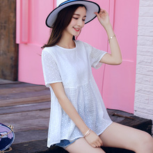 蕾丝上衣 2017夏装新款女装A版镂空纯色小衫圆领短袖纯棉打底衫