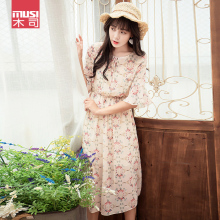 木司2017夏季森女清新裙子复古文艺淑女长裙碎花短袖雪纺连衣裙女