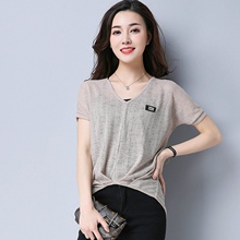 2017夏季新款显瘦百搭t恤女短袖宽松韩范清新上衣V领镂空针织衫潮