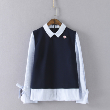 精品单 女装2017春季新款条纹拼接假两件 休闲百搭衬衫上衣潮