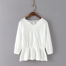 精品单 女装2017春季新款韩版白色V领镂空五分袖休闲衬衫上衣