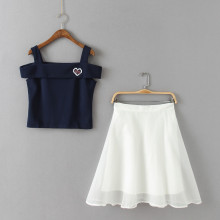 2017春装新品甜美修身露肩一字领印花两件套 气质连衣裙女