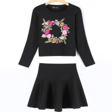 2015韩国东大门秋季新款套装丝光棉绣花长袖短裙两件套连衣裙女装
