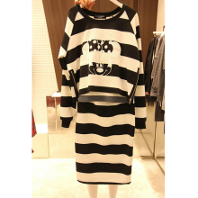 韩国代购时尚套装裙女春2016新款 欧洲站黑白条纹修身连衣裙秋冬